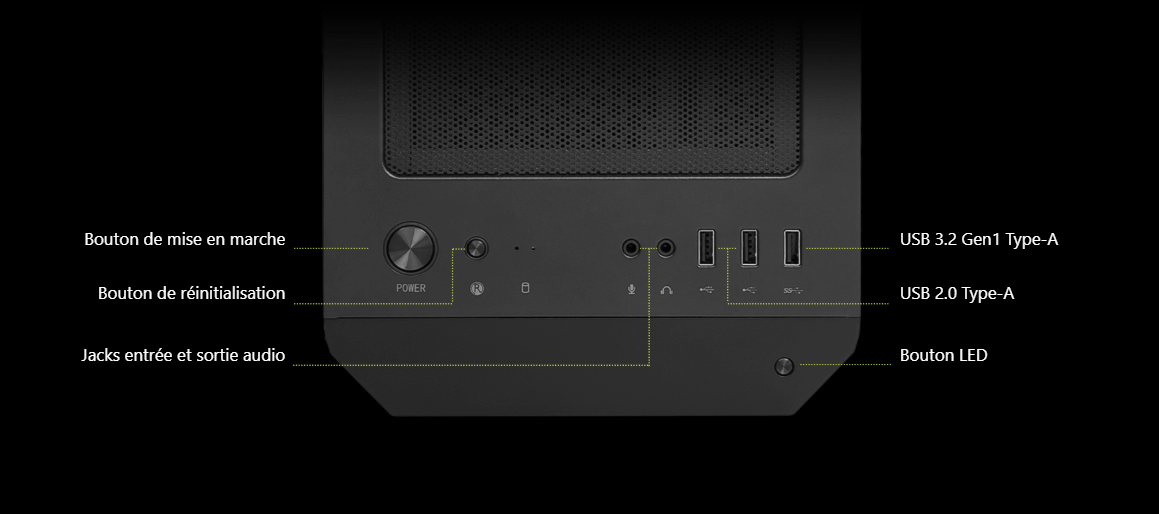 - Convenient I/O: The top panel includes two USB 2.0 ports, one high-speed USB 3.2 Gen 1 port, HD audio jacks, and the LED switch button for easy access.
